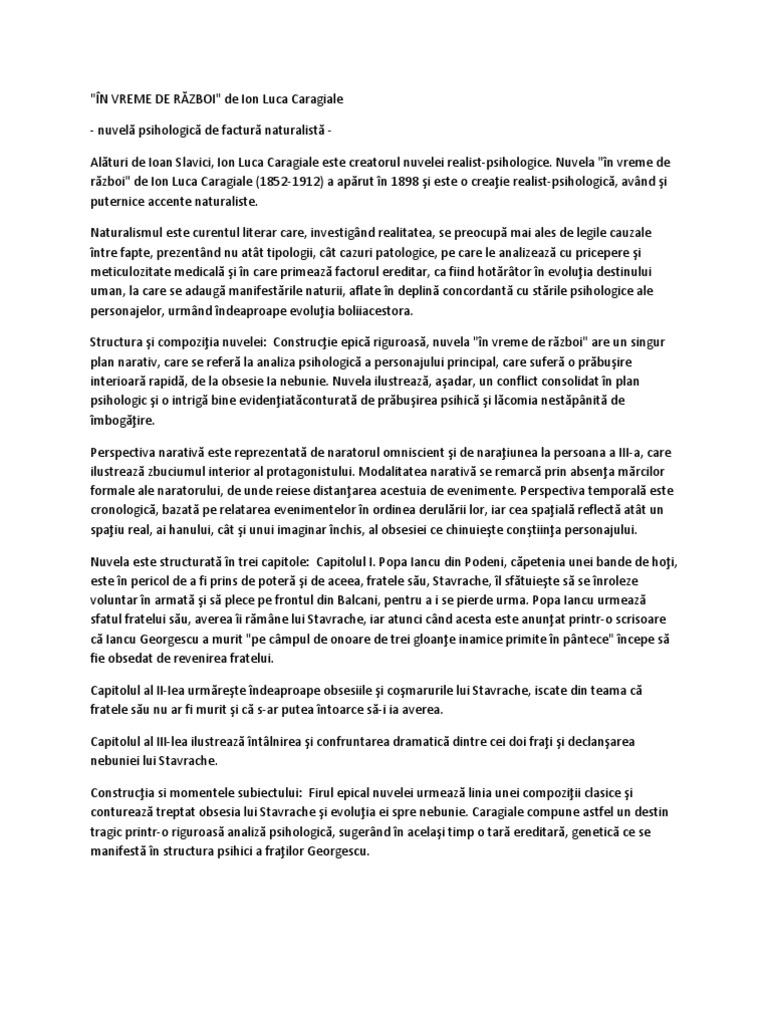 vizitati articolul complet aici : https://www.scribd.com/doc/122854770/in-vreme-de-razboi Hangiul stavrache, mostenitorul fratelui său, preotul iancu din podeni, plecat pe front ca să scape de urmărire. In vreme de razboi este o nuvela psihologica a carei tema o constituie deformarea psihica, pana la alunecarea in nebunie, a omului obsedat de ideea imbogatirii. În vreme de razboi de ion luca caragiale.